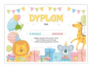 Dyplom Urodzinowy - URODZINKI 02 - ZWIERZAKI - Dyplomik dla dzieci A4