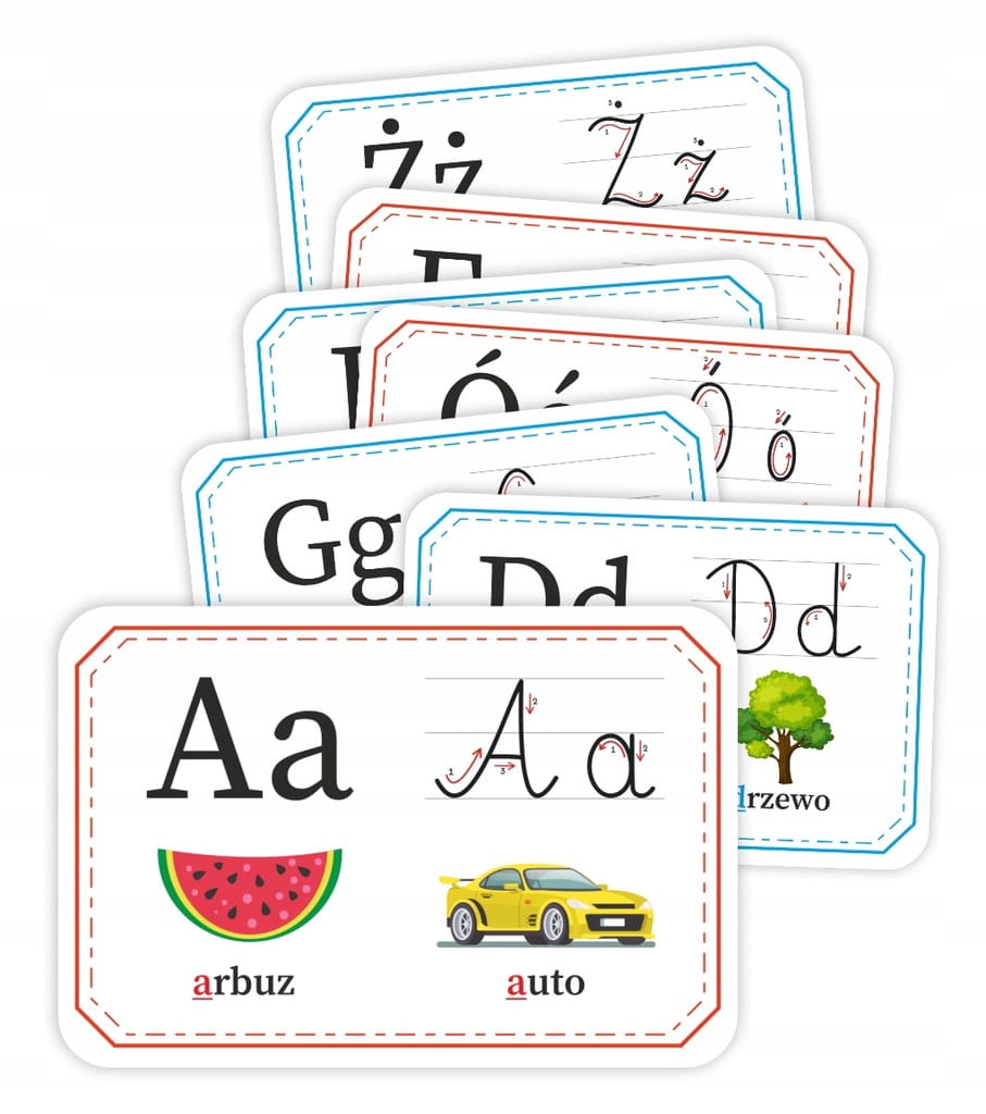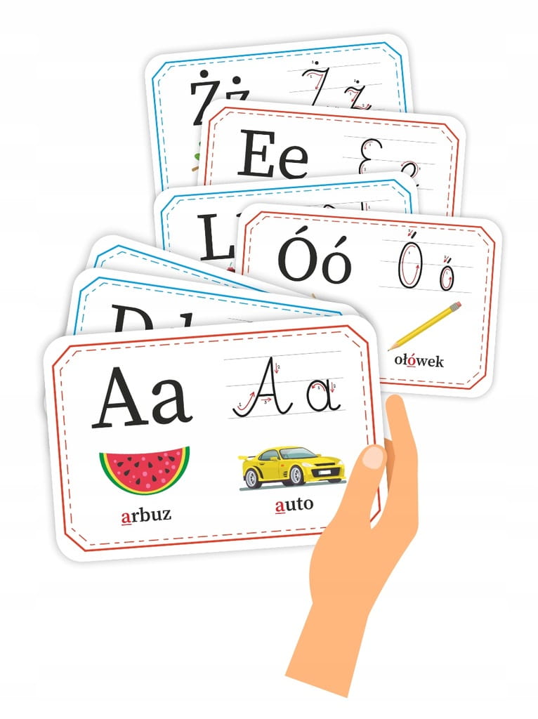 - 32 karty - każda karta przedstawia inną literką łącznie z polskimi znakami. Na każdej karcie po 2 obrazki jako przykład.