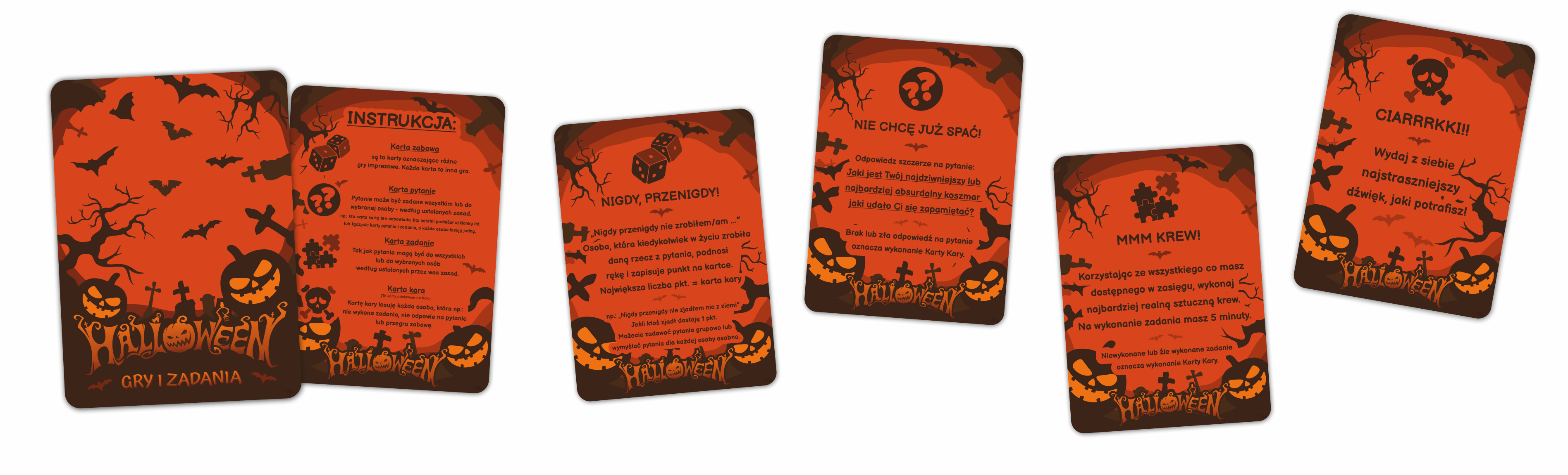 - Aż 66 kart pełnych śmiechu, wyzwań, pytań i halloweenowego klimatu!