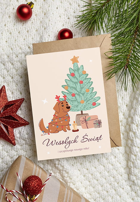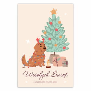Kartka Świąteczna Piesek napis Wesołych Świąt i szczęśliwego nowego roku