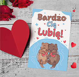 Urocza kartka walentynkowa z motywem słodkich wydr to piękny sposób na wyrażenie uczuć w Walentynki. Kartka sprawdzi się zarówno dla dzieci, jak i dorosłych - napis "Bardzo Cię Lubię!" jest uniwersalny i wzruszający.