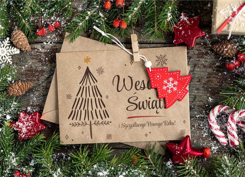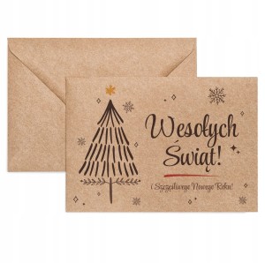 Ozdobna koperta z motywem Wesołych Świąt i Szczęśliwego Nowego Roku. Pasuje do standardowych kartek.