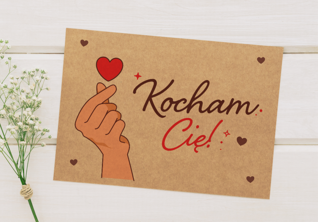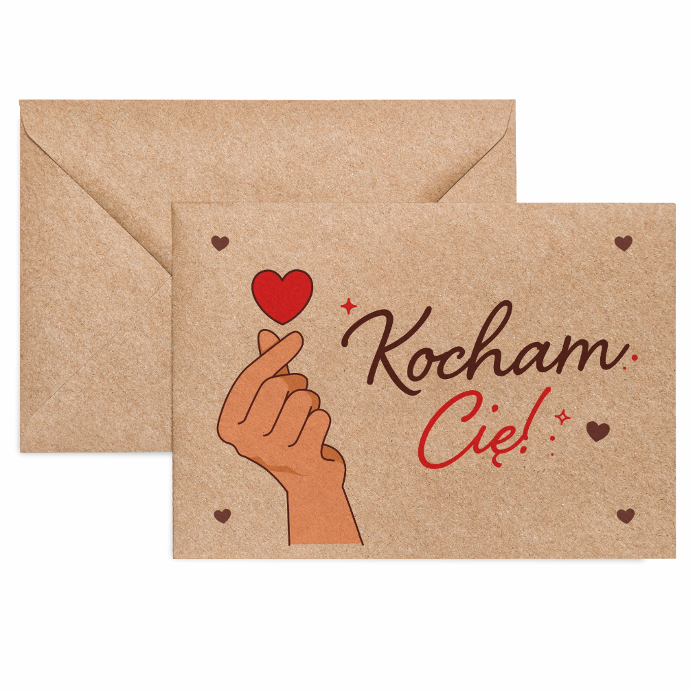 Romantyczna koperta kraft łącząca wyznanie "Kocham Cię!" z uroczym serduszkiem. Połączenie napisu i grafiki tworzy ciepły, romantyczny przekaz.