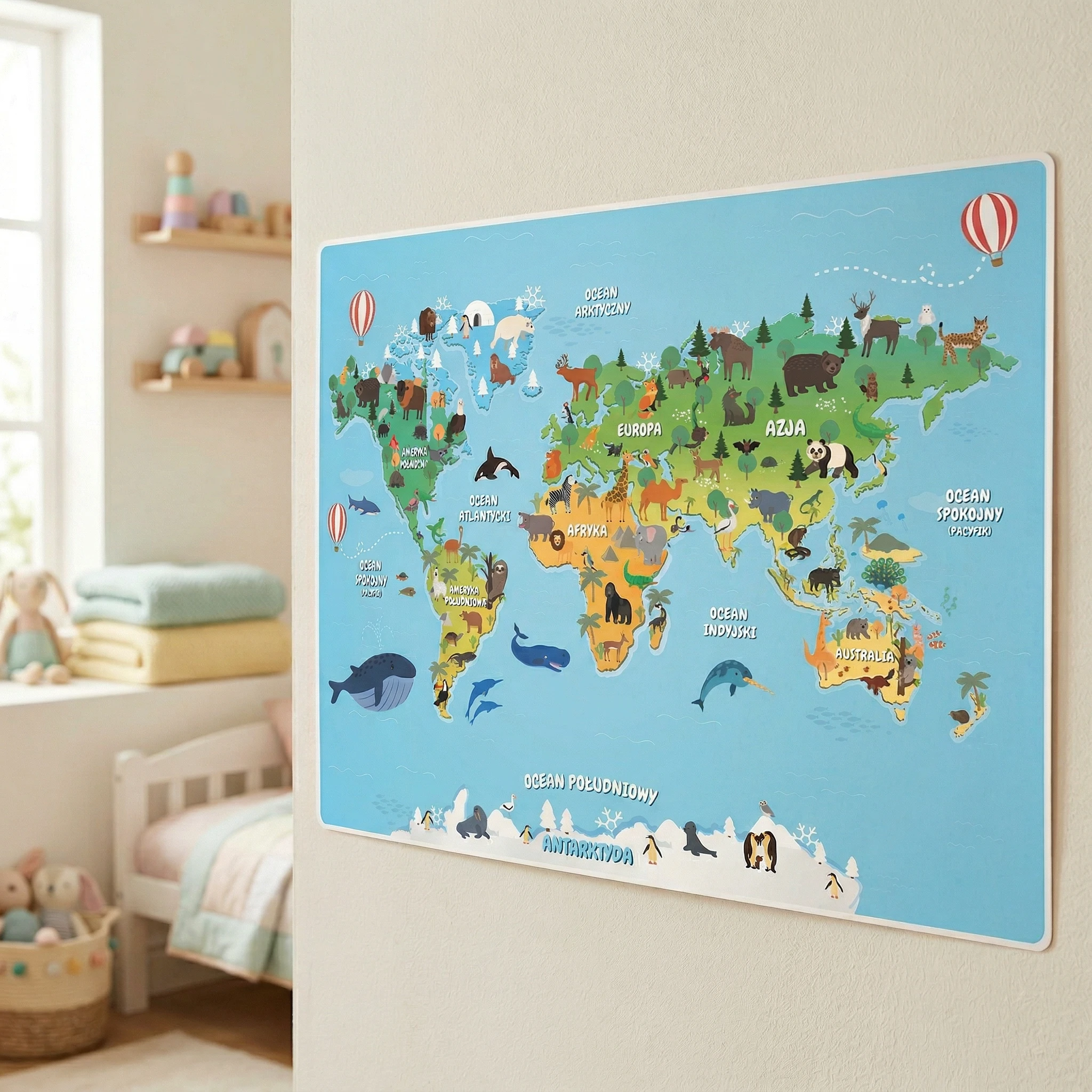 Ten Plakat to doskonały sposób na wprowadzenie dzieci do nauki mapy świata. Podpisy, zwierzątka i kolorowe oznaczenia mają na celu ułatwić zapamiętywanie, a także być ciekawsze dla oka.