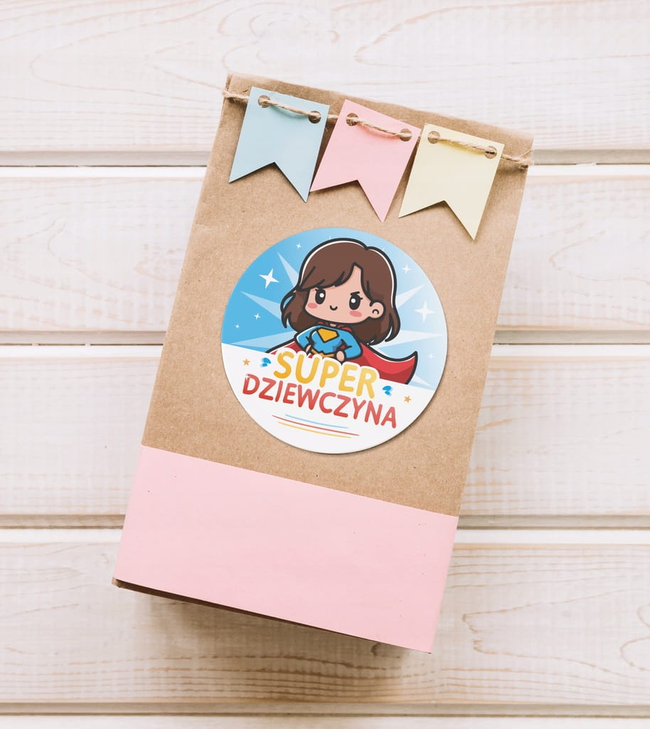 Kolorowe naklejki z napisem „Super Dziewczyna" to drobny upominek na Dzień Kobiet, który sprawdza się samodzielnie lub jako dodatek do prezentu. Średnica 6 cm - wyraźne, widoczne i od razu przyciągają uwagę.