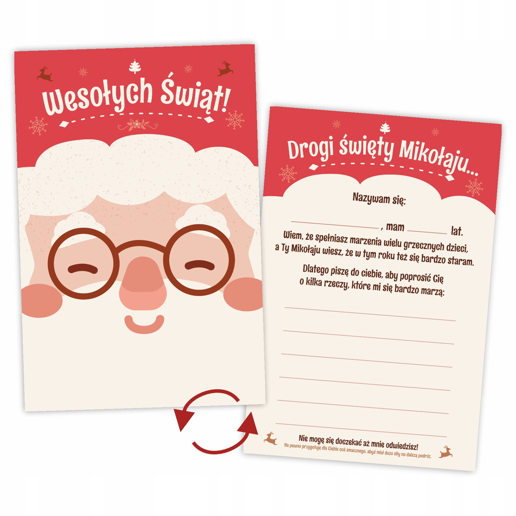 Z jednej strony kartki buzia Mikołaja i napis Wesołych Świąt, z drugiej gotowy wzór na List do Mikołaja!