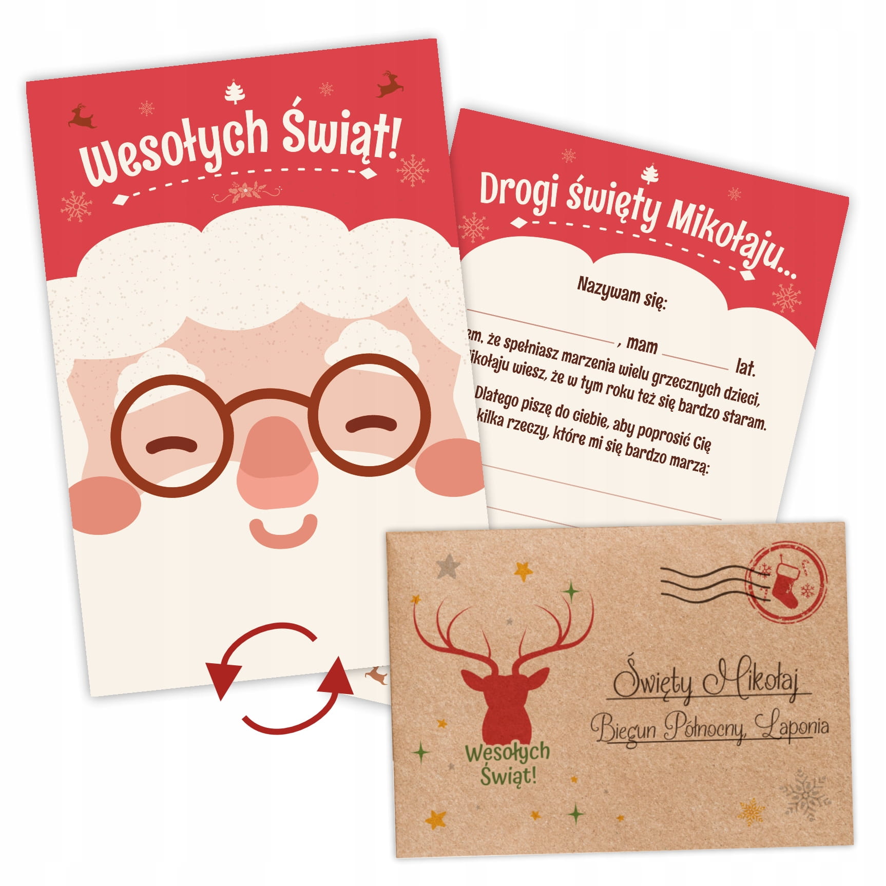 Zestaw LIST DO MIKOŁAJA - Mikołaj Renifer - Koperta + Kartka + Naklejki